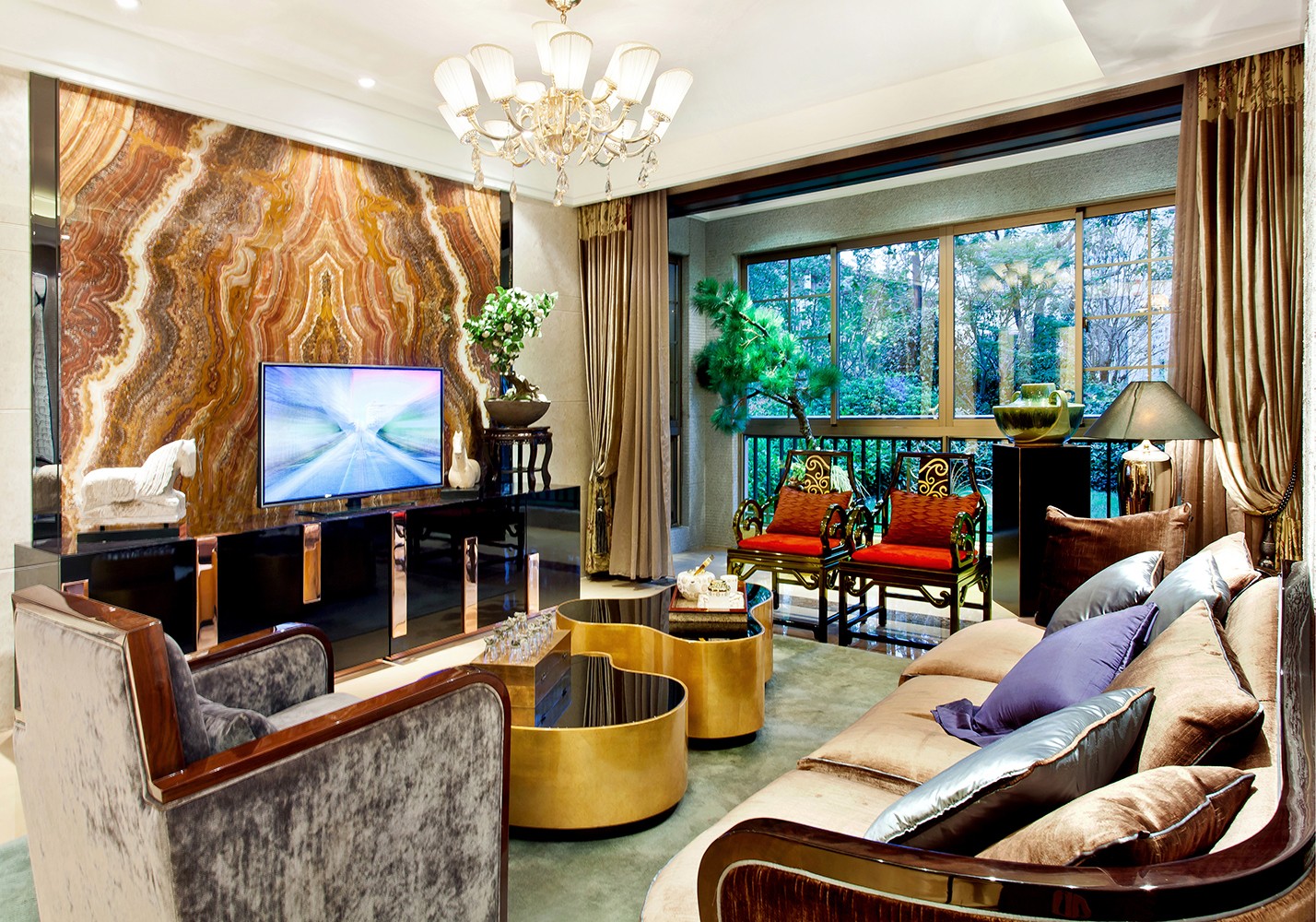 东方美学讲究对称,把融入了中式元素具有对称的图案来装饰,再把相同的家具、饰品以对称的方式摆放,就能营造出纯正的东方情调,更能为空间带来历史价值感和墨香的文化气质。对称设计是中国建筑、家具等普遍采用的构造原则。对称能够减少视觉上的冲击力,给人们一种协调、舒适的视觉感受,在饰品配置过程中应该采用对称原则来摆放饰品;
